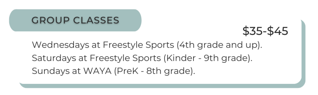 We offer customizes packages for groups of middle schoolers and high schoolers, who want to take their game to the next level. We have an holistic approach, where besides skill development, we also work on strength training, conditioning, balance, nutrition and flexibility. Contact us directly for more information.